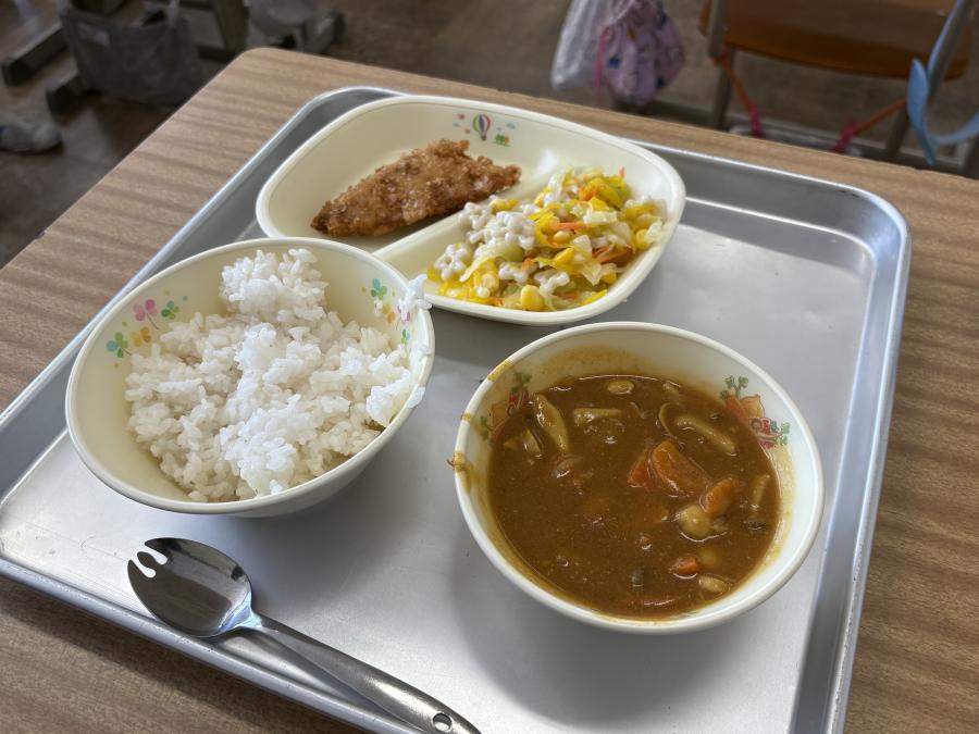 麦ご飯、牛乳、きのこカレー、モウカサメのフライ、パルセイロ勝ち星サラダ!