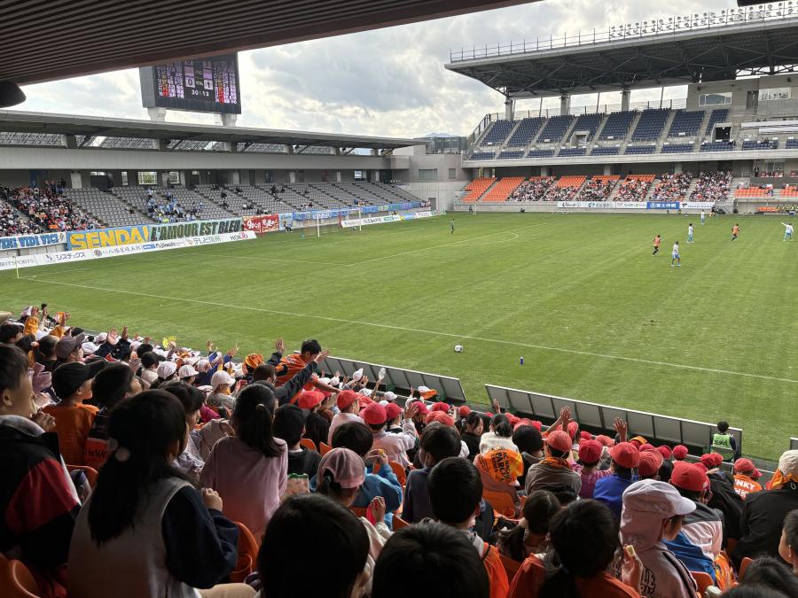 試合は1-2で惜しくも負けてしまいましたが、子どもたちの元気な声援がスタジアム全体に響き渡り、選手たちのプレーを大きく後押ししました。
