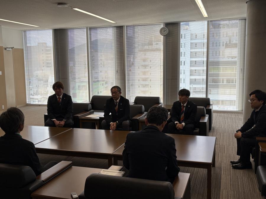 令和7年12月9日(火曜日)、明治安田J3リーグ2025シーズン全日程が終了したことに伴い、株式会社パルセイロ・アスレチッククラブの澁谷泰宏代表取締役社長、市原侑祐取締役副社長、加藤弘堅選手、小西陽向選手が長野市役所を訪問し、荻原健司市長へ今シーズンの報告を行いました。